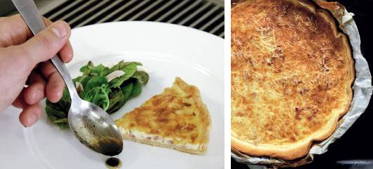 «Я использую готовое песочное тесто. Разложите его на бумаге в форме для пирога и поставьте в духовку на 180 °С, накрыв сверху пергаментной бумагой. Насыпьте сверху немного чечевицы, чтобы не улетела, — так меня учила мама. Одновременно поджарьте в сковороде 100 г маленьких кусочков сала, смешайте 125 г сметаны с четырьмя яйцами, положите поджаренное сало, добавьте соль, перец, мускатный орех и 50 г тертого сыра. Выложите смесь на тесто и посыпьте 20 г тертого сыра. Запекайте в горячей духовке до золотистого цвета и подавайте теплым с зеленым салатом».