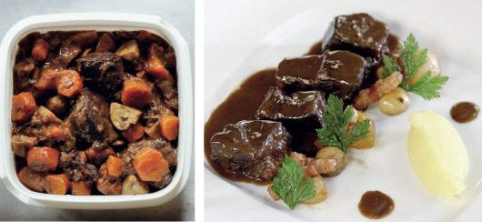 «Налейте в чугунную кастрюлю 4 л хорошего красного вина, подогрейте его. Обжарьте в глубокой сковороде по два или три кусочка говядины на человека с крупными ломтиками сала (150 г), отставьте в сторону. Нарежьте мелко три луковицы, поджарьте до полупрозрачного состояния в той же кастрюле, где готовили мясо. Добавьте немного воды, затем снова положите туда мясо, 6 мясных косточек и присыпьте мукой. Затем потихоньку добавьте горячее вино, 100 г томатной пасты, 1 кг нарезанной на крупные дольки моркови, пять зубчиков чеснока, пучок душистых трав, пучок петрушки и 1 стручковый перец. Готовьте 5–6 часов на медленном огне. За 30 минут до готовности добавьте 200 г целых или нарезанных на 4 части шампиньонов. Подавайте с картофелем или длинной лапшой».