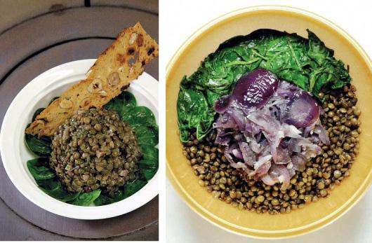 «Положите в кастрюлю 200 г чечевицы. Залейте холодной водой, посолите, доведите до кипения и варите 30–40 минут. Нарежьте кружочками две красные луковицы, поджарьте в 3 ст. ложках оливкового масла. Когда они станут мягкими, добавьте 2 зубчика измельченного чеснока, соль, перец и оставьте на огне еще на 5 минут. Сварите на пару 500 г шпината (3 минуты). В салатнице перемешайте чечевицу, шпинат, лук, сверху посыпьте немного петрушки и кориандра, сбрызните лимонным соком, подавайте на стол теплым».