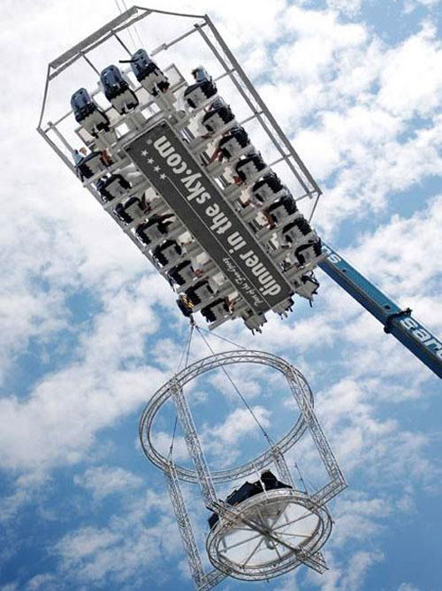 5. Пообедать на высоте 50 метров над землей предлагает ресторан Dinner in the Sky в Брюсселе. Всего за столом могут разместиться 22 человека, не считая трёх поваров, официантов и конферансье. Всю эту компанию вместе со столом, навесом, светильниками, креслами с ремнями безопасности доставляет в “небо” подъемный кран. На нижней площадке располагается рояль, на котором вживую играет музыкант. Общий вес «ресторана» примерно 2,2 тонны.