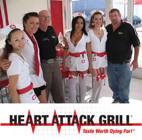 4. В Heart Attack Grill, расположенном в Финиксе, США, подается на стол все, что вредно для здоровья. Меню изобилует пищей с огромными долями холестерина, а также комбинированными обедами и ужинами с включением в комбо пива и сигарет. Самое интересное, что персонал заведения одет в сексуальные наряды медсестер, готовых всегда придти на помощь. Дополнительная фишка заведения – бонус для посетителей, умудряющихся съесть самый большой в меню бургер. Таких «способных» людей официантки-медсестры отвозят на кресле-каталке до их машин.