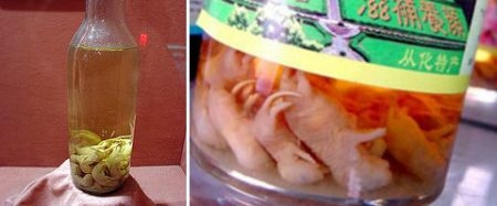 Маленьких мышат (еще слепых) кладут в бутылку с рисовым вином. Этот традиционный оздоровительный напиток пьют в Китае и Корее. На вкус он, говорят, похож на керосин.