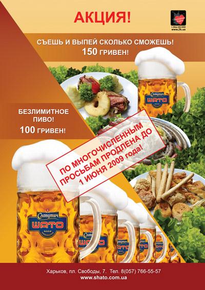Пакет первый- меняем 100грн. на море пива, пакет второй- съешь и выпей сколько сможешь всего за 150грн. Акция действует до 30 апреля.