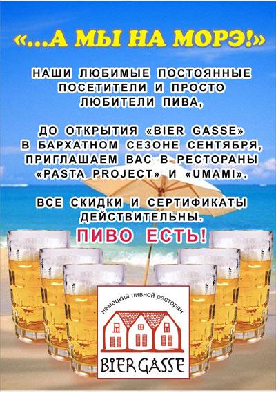 Наши любимые постоянные посетители и просто любители пива, до открытия «BIER GASSE» в бархатном сезоне сентября, приглашаем вас в рестораны «PASTA PROJECT» и «UMAMI».