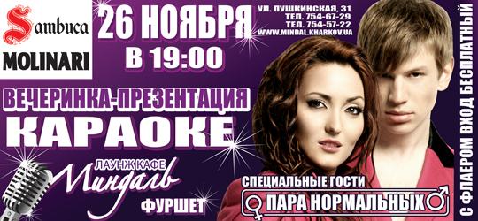 26 ноября в 19:00 вечеринка-презентация караоке в лаунж-кафе Миндаль. Специальные гости: шоу-группа "ПАРА НОРМАЛЬНЫХ".
