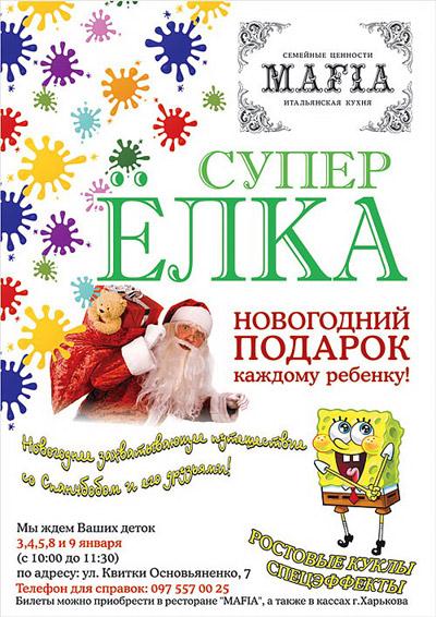 Захватывающее путешествие в Новый год со Спанчбобом и его друзьями, ждет Вашего ребенка в ресторане "Mafia" Ростовые куклы, потрясающие спецэффекты, и конечно же подарки сделают этот день незабываемым для Вашего малыша.
