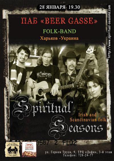 Сегодня в 19.30 в пивном ресторане Bier Gasse выступает легендарная группа ирландского и скандинавского фолка Spiritual Seasons - танцы и музыка. Вход 50 гривен в подарок бокал пива. Билеты и места можно заказать по телефону 728-24-77