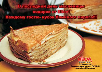 С 8 по 14 февраля в спорт баре Elion - масленица! В последний день масленицы подарок от Elion! Каждому гостю - кусок блинного пирога!