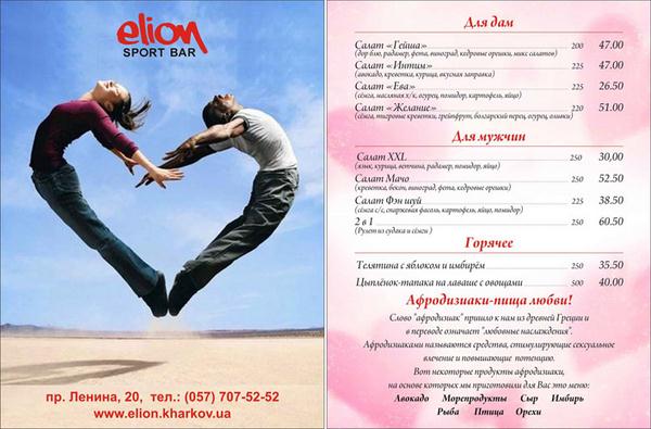 Спорт бар "elion" - это не только здоровый образ жизни.В этот романтический праздник,мы создадим для Вас чарующую атмосферу музыки и свечей...+ специальное меню с афродизиаками!!!