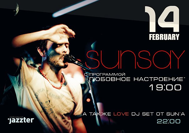 Описание события: По-другому и быть не могло ... В день ВСЕХ ВЛЮБЛЕННЫХ, в день поцелуев, в день объятий будут звучать только песни о любви... песни всех любимых исполнителей Sunsay. Группа сыграет все песни, которые, по их мнению, пропитаны Любовным настроением. И еще пару сюрпризов... И только о любви. + dj сэт от Sun'a.