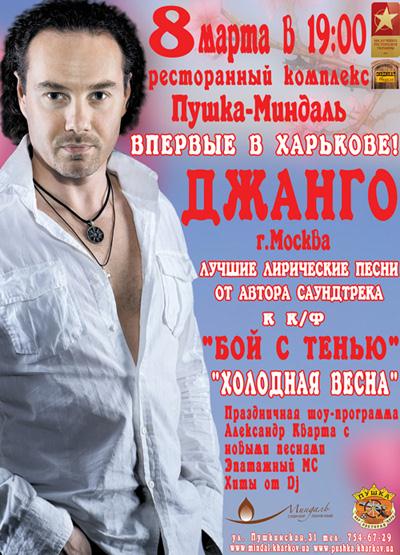 8 марта в 19:00. Ресторанный комплекс Пушка-Миндаль. Впервые в Харькове! ДЖАНГО (г. Москва)! Лучшие лирические песни от автора саундтрека к к/ф "Бой с тенью" "Холодная весна".