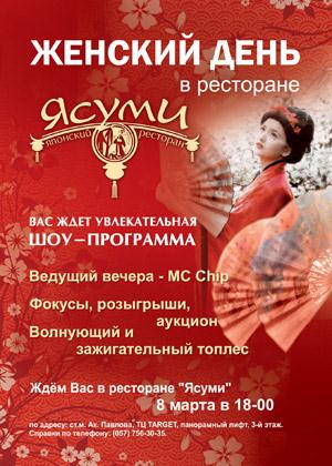 Вас ждет увлекательная шоу-программа: фокусы, розыгрыши, аукцион; волнующий и зажигательный топлес. Ведущий вечера –MC Chip. Ждем Вас в ресторане «Ясуми» 8 марта в 18.00.