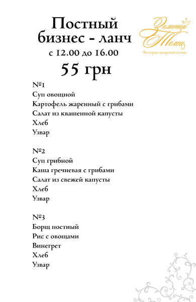 Шеф-повара ресторана "Золотой Телец" разработали специальное постное меню для соблюдения строгого поста, а также постный бизнес-ланч. Мы поможем Вам питаться правильно в это важное время.