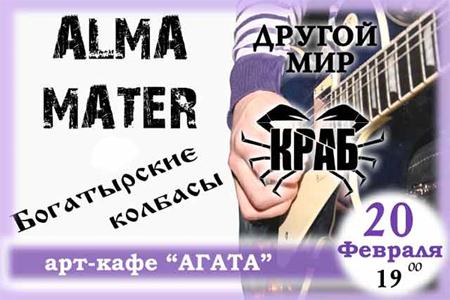 20 февраля. 19.00. Alma Mater. Богатырские колбасы. Другой мир. Краб.