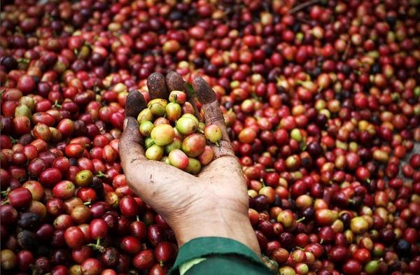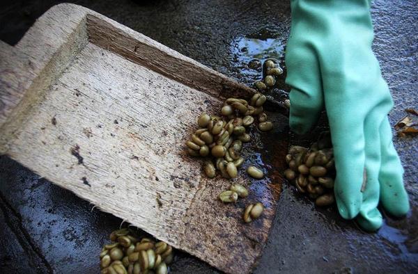Работники собирают кофейные бобы, уже готовые к окончательной промывке и сушке.